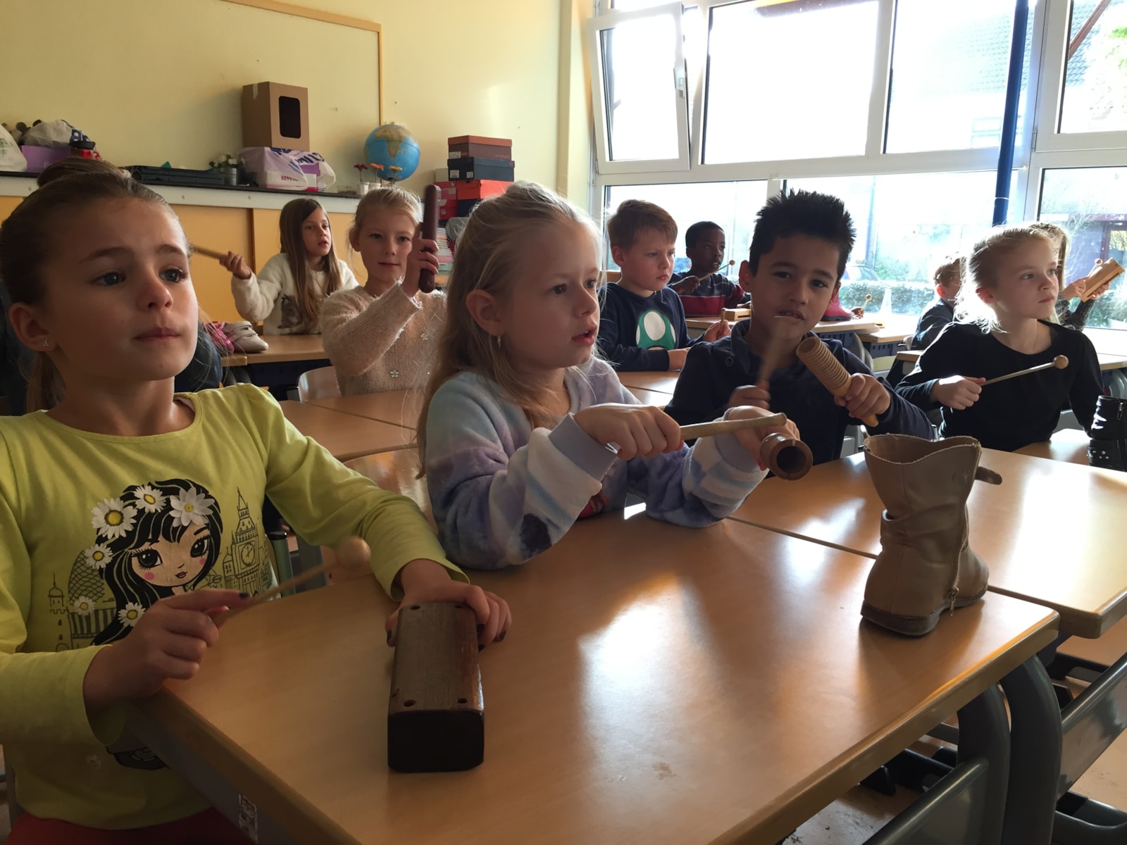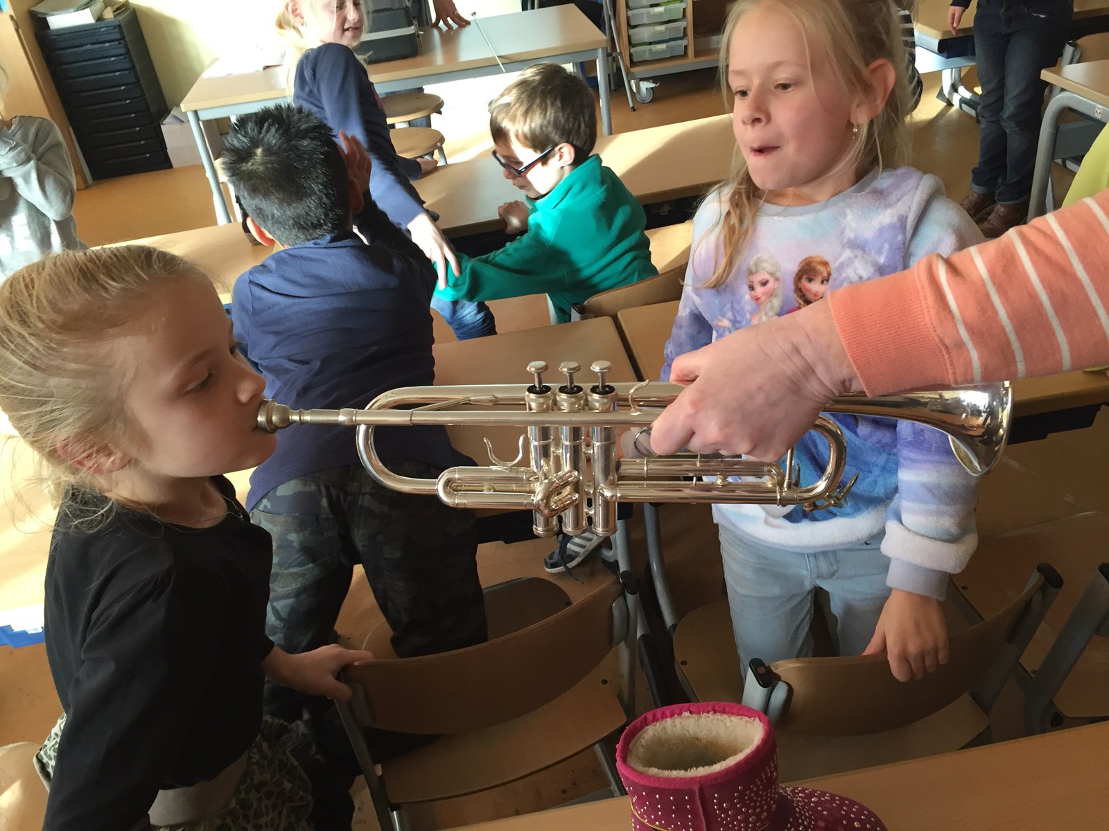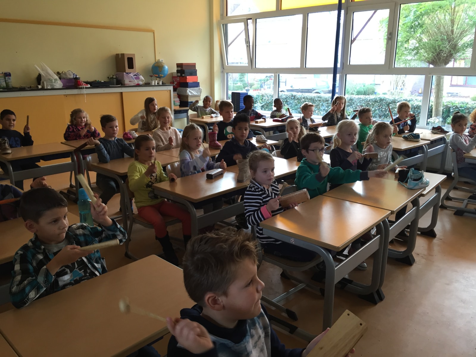 We hebben met heel groep 4 een super leuke muziek les gevolgd van showband jong holland. Tijdens de les hebben de kinderen de basiskennis geleerd van de noten en het klappen volgens een maat. Ook zijn we met verschillende muziekinstrumenten gaan de gang gegaan. (zie foto’s) Alle kinderen hebben een keertje op een trompet mogen blazen. En lastig dat dit was.
