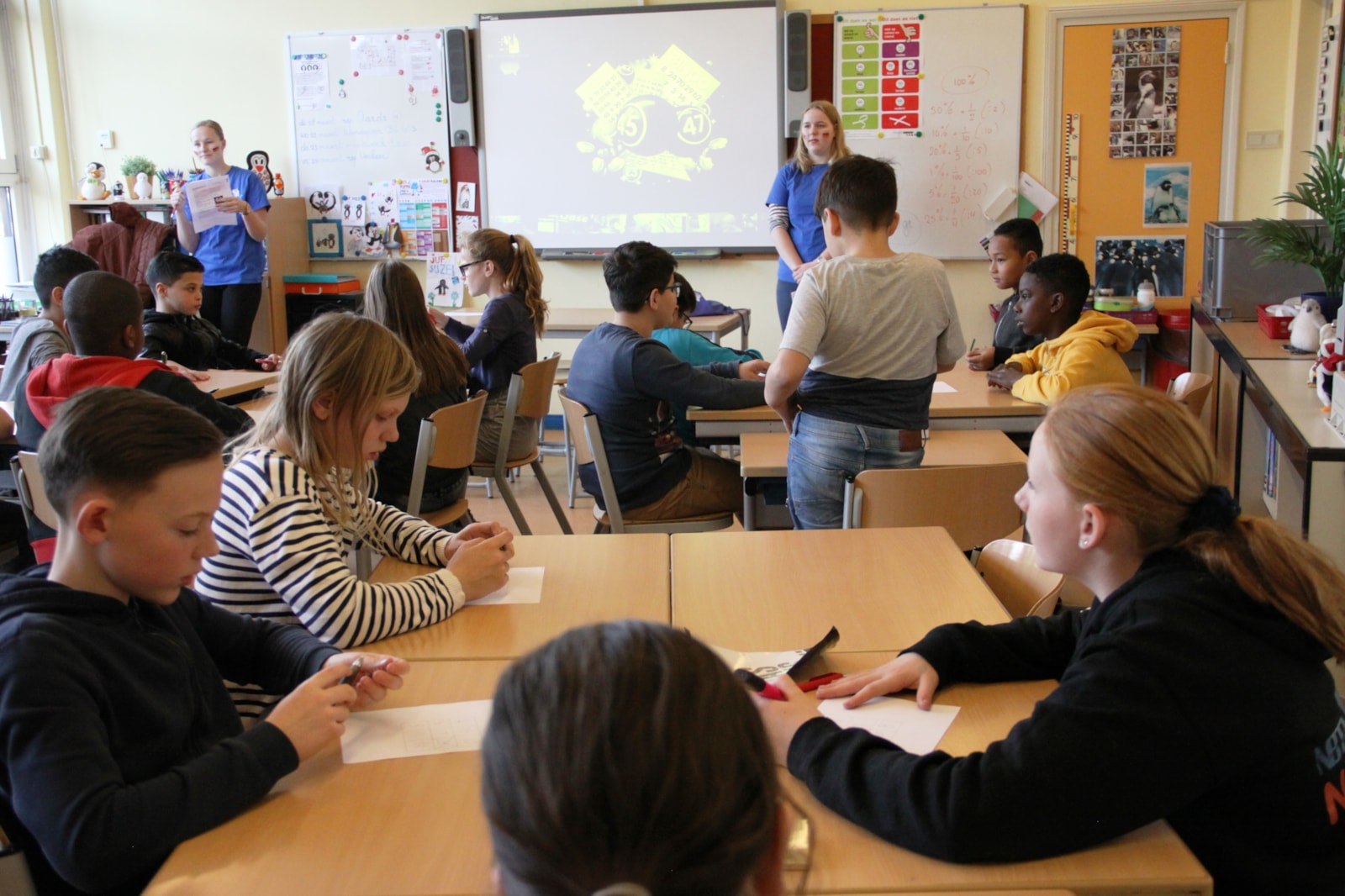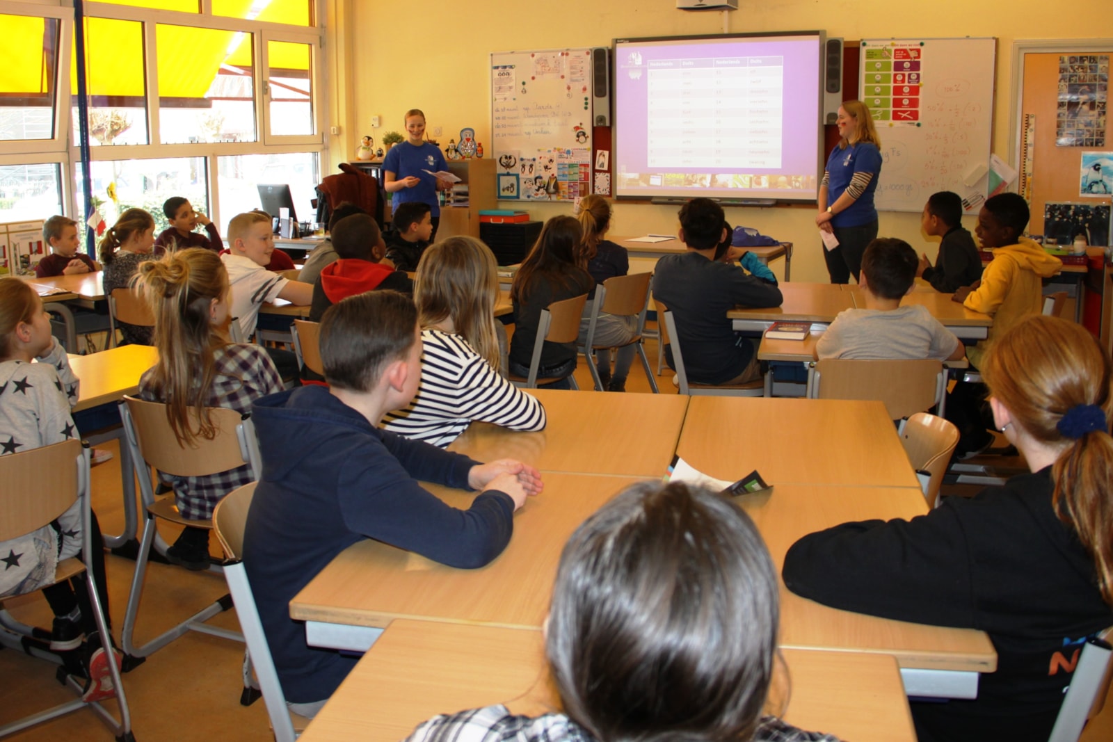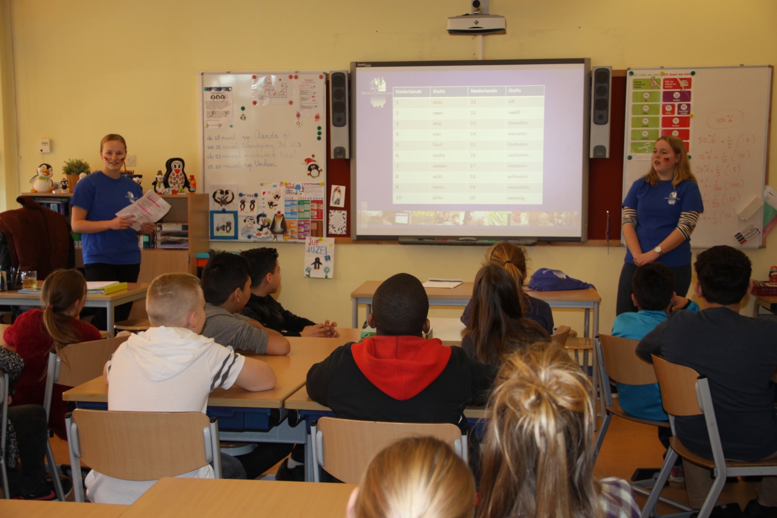 ”Dit is voor het eerst dat ik Duitse les heb. Ik vind het heel erg leuk om een nieuwe taal te leren die ik dan met mijn moeder kan oefenen. Duits praten is best lastig,” aldus Senna Baan, leerling van groep 7 van christelijk kindcentrum De Bron, een van de 19 kindcentra van PIT kinderopvang & onderwijs. Daar gaven Esmeralda Diephout en Renée den Hartog les. Ze vertelden iets over Duitsland en Duitse merken en leerden de kinderen zich voor te stellen in het Duits. Tot slot was er bingo om te oefenen met de Duitse getallen tot en met 20. Leerkracht Suze Bezemer van groep 7: ”Op De Bron staat natuurlijk Engels op het programma, maar Duits niet. De kinderen zijn heel erg enthousiast en ik vind het een prima initiatief om hen zo kennis te laten maken met het Duits.”