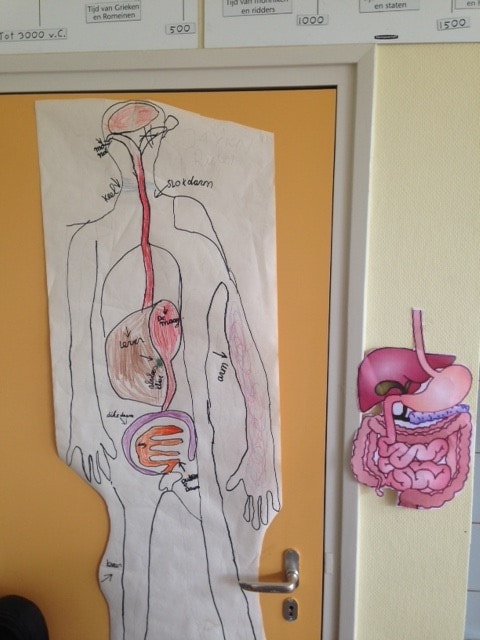 Later hebben we ook gekeken naar de organen in het lichaam. De kinderen hebben elkaar overgetrokken op behangpapier en de organen er in getekend.