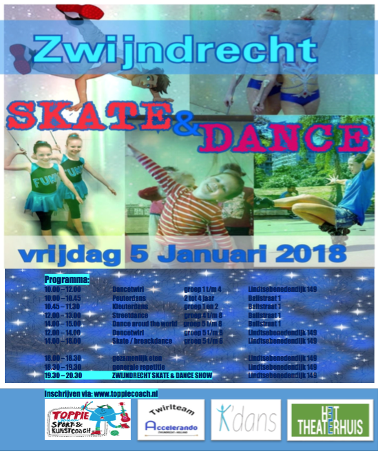 Woensdag 3 januari het jaarlijkse Toppie Nieuwjaars Sportfeest in de Develhal en vrijdag 5 januari Zwijndrecht Skate & Dance georganiseerd door de cultuurcoaches met diverse workshops.