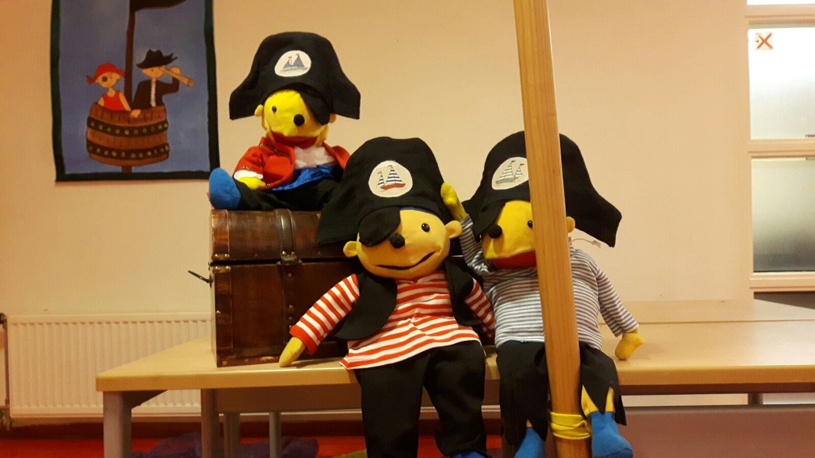 in de groepen 1/2 zijn ze bezig met het thema piraten. Dankzij de creatieve oma van Shane uit groep 2/3 heeft Pompom zijn eigen piratenkleding.