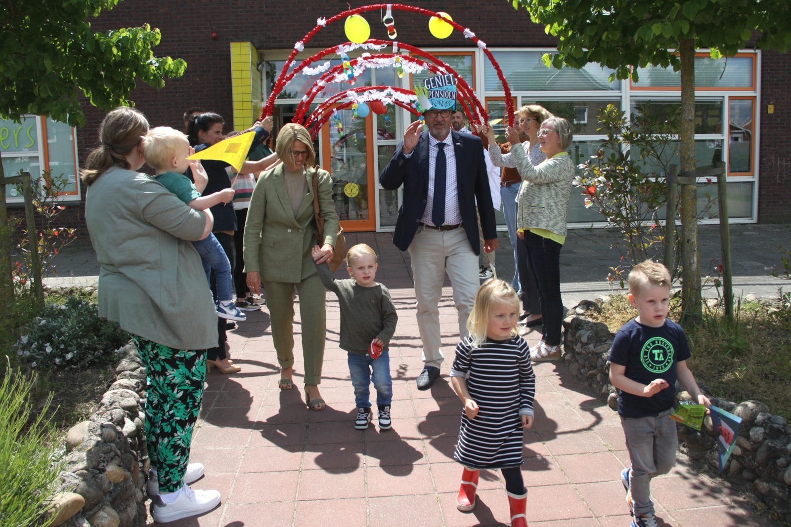 De kinderen van kindcentrum De Rakkers en de medewerkers van De Rakkers en het bestuurskantoor van PIT kinderopvang & onderwijs zwaaien Max van de Pol uit.